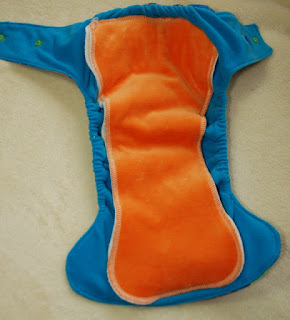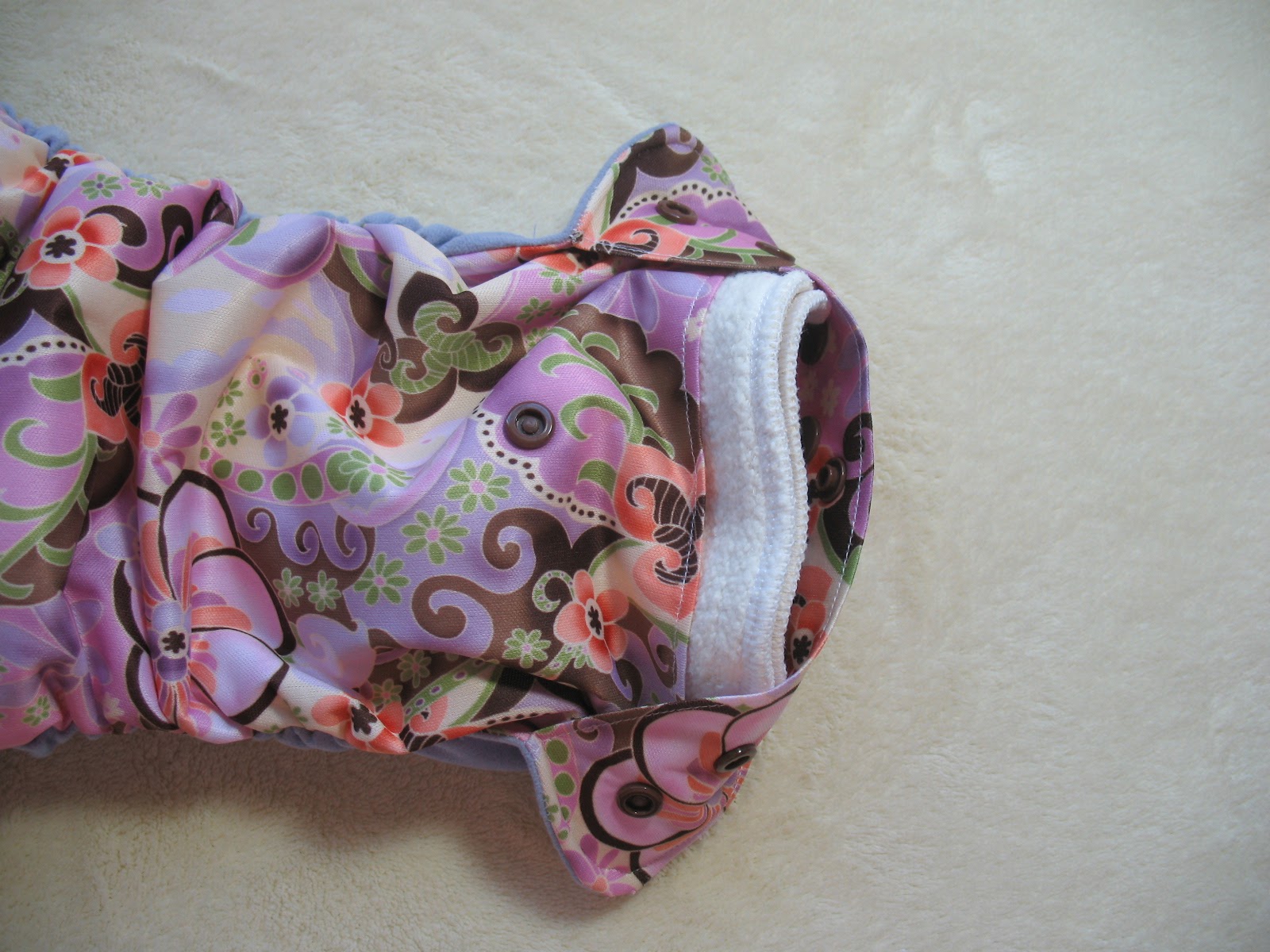 There is a front opening between the inner layer and the outer layer, which forms a "pocket" into which an absorbent insert can be placed. The opening is secured closed with a snap.